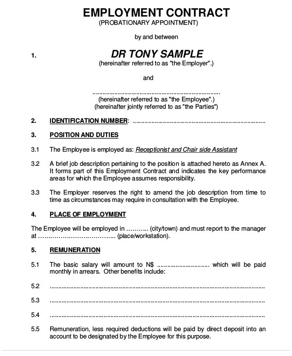 free contract of employment templates 6 contract for services template this is a template which you can use if you are hiring freelance or contract employees video tutorials we have undertaken to produce a series of video tutorials to help employers better understand complex hr issues the first one on how to issue a contract of employment is now available 18 job contract templates word pages docs free do not worry if you do not have enough time to do this preparing the job contract has been made easy for you by the introduction of employment contract template the readymade outline with sample data that you can edit to suit the need of your company usually depending on the job that you would like to offer sample basic contract template sample templates a contract has to be clearly drafted with valid points missing out of one valid point might affect one of the parties too severely in the case of supply contract templates also keen notice is required at the time of selection of the template as it should correspond to the situation employment contract template get free sample employment contract template what is an employment contract an employment contract is a legal agreement between an employer and an employee which includes any details relevant to the employment arrangement for example the term of employment the compensation provided and other relevant information 13 job contract templates pages word docs 13 job contract templates pages word docs also known as employment contract this is used by the employer which sets all the terms and condition for the employee a job contract can be prepared on a job simple contract template or it may be verbal sometimes depends upon the type of job 32 sample contract templates in microsoft word hloom this category of contract templates is for contractors who will be providing a service over a period of time that includes materials the contracts allow for defining the scope of the job and for the dimensions and quantities of materials purchased or supplied by the contractor it is easy to add in the details specific to the project agreed employment agreement sample stanford university 2 4 vacation the employee shall be entitled to vacations in the amount of weeks per annum 5 benefits the employer shall at its expense provide the employee with the health plan that is currently in sample contracts contract templates 513 sample contract templates you can view download and print for free there are contracts and agreements for many home and business arrangements including home maintenance services modeling and photography contracts rental contracts event contacts and more employment agreement sample template word and pdf an employment agreement sometimes called a work agreement is the document by which employers and their employees or contractors or freelancers can define their rights and obligations at the start of the employment relationship often times employment relationships begin with an offer letter that defines certain terms and conditions of the employment contracts written statement of employment an employer must give employees a written statement of employment particulars if their employment contract lasts at least a month or more this isn t an employment contract but will