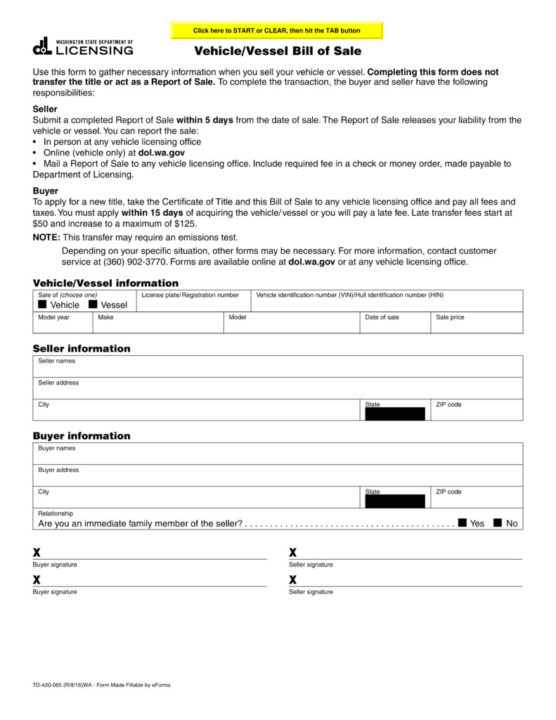 free washington vehicle vessel bill of sale form pdf from Bill Of Sale Template Wa
