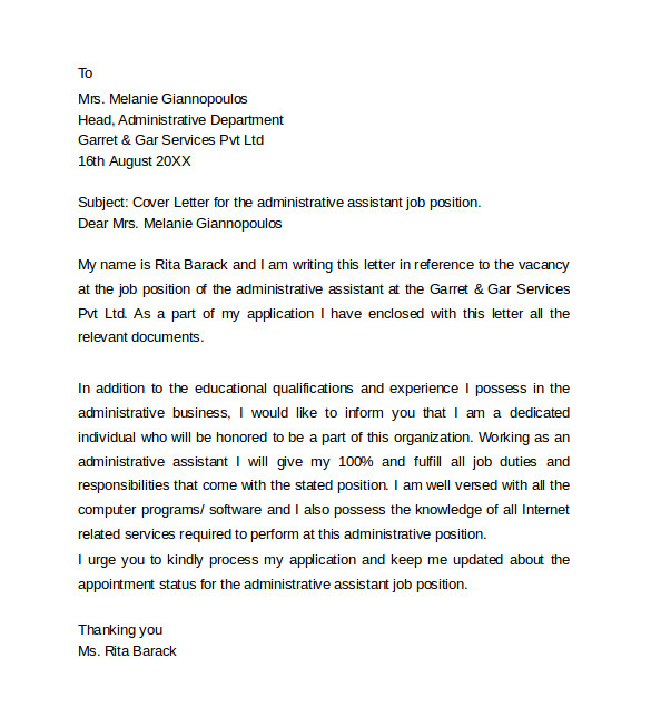 8 sample administrative assistant cover letter templates from Cover Letter For A Administrative Assistant Position
