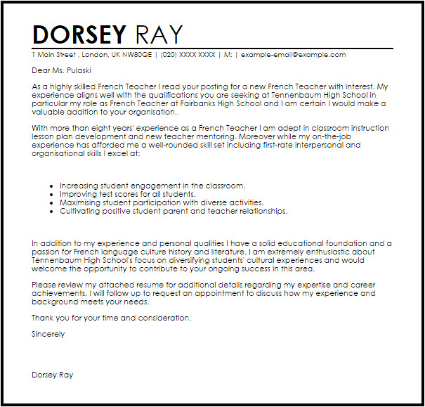 cover letter french teacher from Cover Letter In French Examples