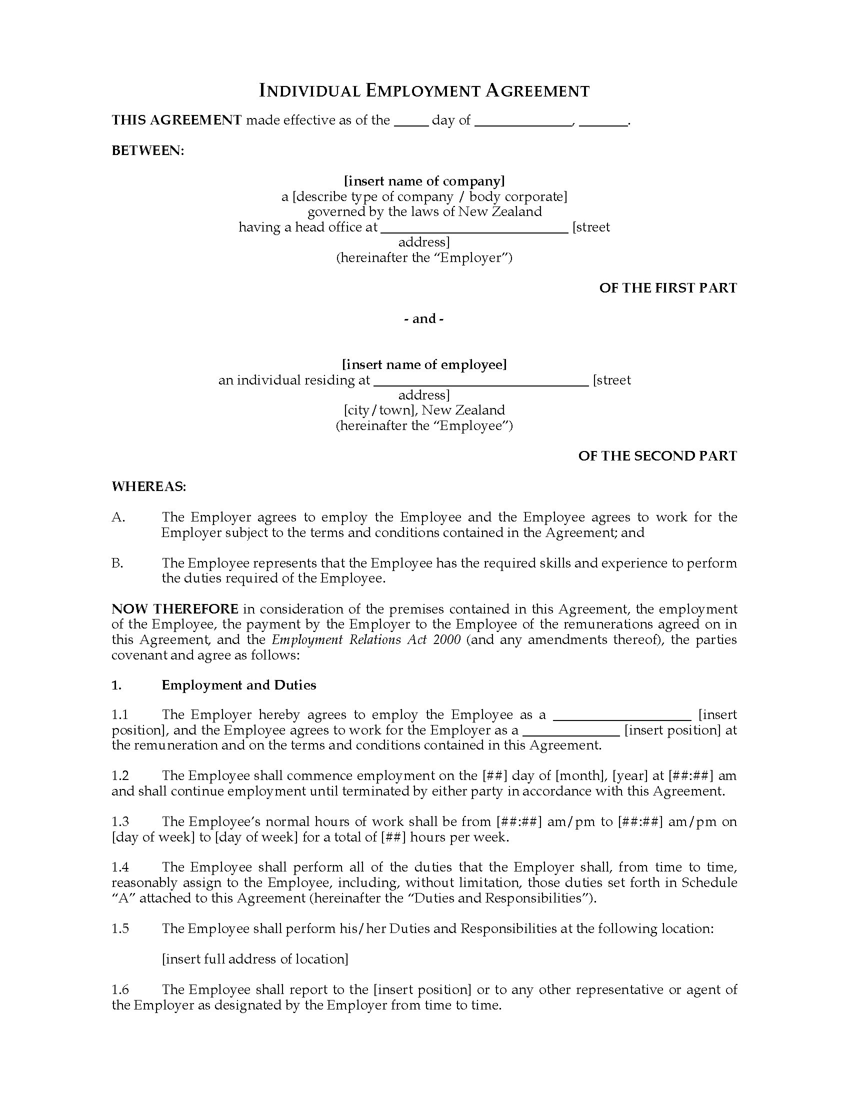 employment agreement builder employment new zealand visit our employment agreement builder external link for sample clauses of things you must include in employment agreements and sample clauses of things you should or could include in an employment agreement employment agreement builder creating an employment agreement is an important step when hiring staff this tool guides you through the steps to create an agreement for a new employee employment agreement template free contract of employment create print or download an employment agreement using our online template quick easy and free creating an employment agreement business govt nz creating an employment agreement you must have a written employment agreement also known as an employment contract for all employees though you don t need them for contractors or volunteers the employment relations act has changed employment agreements document templates lawlive employment agreements every employee must have a written employment agreement that determines the relationship between the employer and employee new zealand employment agreement legal forms what is a employment agreement new zealand employment agreement an employment agreement is used when an employee is hired or re hired and states the compensation the employee will receive and any other terms and conditions of employment that may exist individual employment agreement template nz beauty therapy individual employment agreement clinic spa name here individual employment agreement template employee s name casual employment contract agreement employers casual employment contract designed specifically for the new zealand market and the employment relations act 2000 as amended all our employment agreements aim to maximise the protection of the employer and their business sample casual employment agreement sample templates making the template for casual employment agreement is quite easy when you have the templates the templates are to make the agreement look official and to help you save money on lawyer charges and time on making the full contract therefore you will be able to save on time effort and money and the job will be hassle free and accurate you may also see employment agreements employment new zealand employment agreements contain the terms and conditions of employment every employee must have a written employment agreement