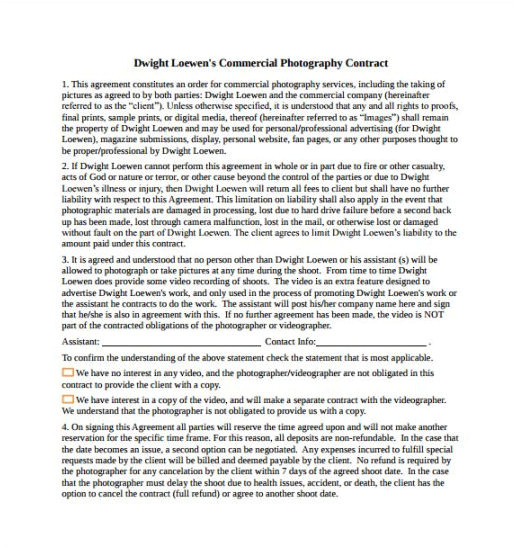 product photography contract template pdf templates there are many genres or types of photography but this sample contract is specifically designed for product photography in today s digital age product photography is the most common tool used for marketing and advertising a photography contract proposal templates for 2019 12 photography quotes proposals contracts order forms and etc use these ready made templates for attracting potential clients and winning more deals here are the essential templates you need to run your photography business smoothly photography contract template 40 free in word pdf photography contract agreement to client product photography entails diverse needs and includes various aspects since the needs of different businesses are diverse you ought to have a common format of contract that covers all essential elements of a product photography agreement how to write a photography contract free sample template contracts are one of the main templates for photographers that can make or break your business photography contracts are key for establishing and managing expectations and protecting both the client and photographer in case of a mishap 9 commercial photography contract templates free word the contract will be an agreement between you and the client stating that you are willing to deliver the service under conditions specified and can be written on commercial photography contract template papers photography contract template 2019 update slrlounge com wedding photography contract by best templates here s another inexpensive contract template for you to consider click here to view this site contains affiliate links to products 17 best photography contract examples templates if you recently got into the business of event photography consider the use of this event photography contract template that contains just the right elements and contents that will help you get started aside from that this template is versatile enough that whatever event you are going to document this template will get you covered right photography contract contract templates customize your photography contract and print in minutes step by step guidance throughout the process powered by rocket lawyer 22 photography contract templates word pdf apple the above template gives you a detailed photography contract which includes all the necessary points of a photography assignment such as name of the client location photographer s arrival and estimated end time etc 9 free photography contracts from docracy download now why have photography contracts the purpose of a contract is to clearly set the rules of engagement what is acceptable by both parties and how to resolve possible conflicts