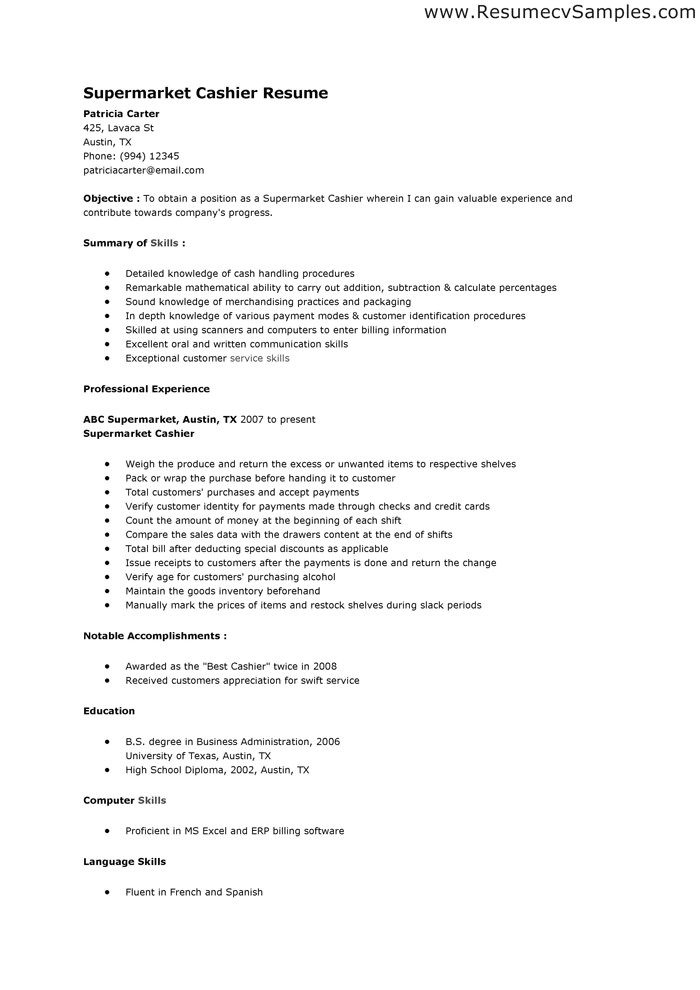 cashier resume sample sample resumes from Resume Sample For Cashier At A Supermarket